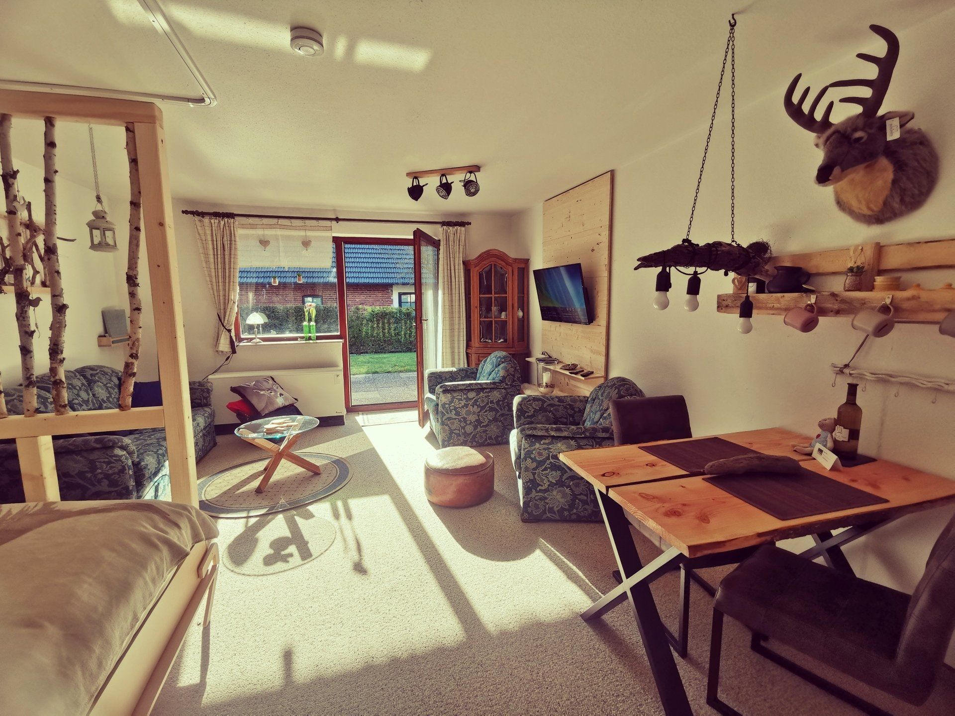 Wohn-Schlaf-Esszimmer mit TV, Nische mit Bett (140 x 200 cm),